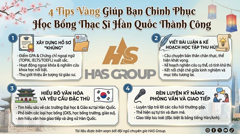 Hành trình săn học bổng Thạc sĩ Hàn Quốc đòi hỏi sự chuẩn bị kỹ lưỡng và chiến thuật thông minh. Tại HAS Group, chúng tôi không chỉ tư vấn hồ sơ mà còn đồng hành cùng bạn trong việc định hướng chọn trường và tối ưu hóa thế mạnh cá nhân.