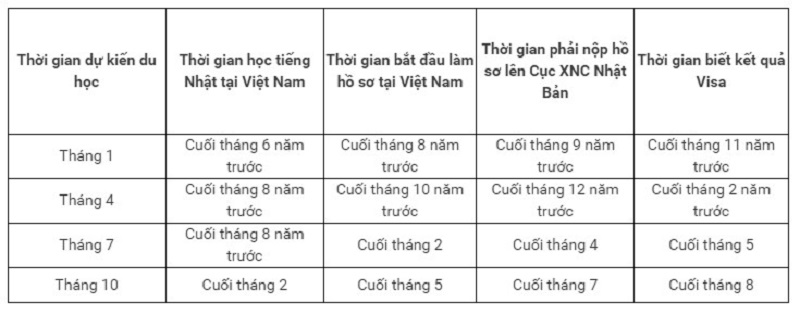 Thời điểm du học Nhật Bản của 4 kỳ trong bảng dưới đây được ước tính dựa theo thời gian đào tạo tiếng Nhật cấp tốc tại Tokai Việt Nhật đối với những bạn chưa học tiếng Nhật bao giờ. Thời gian đào tạo khóa cấp tốc N5 trong khoảng 3 tháng.